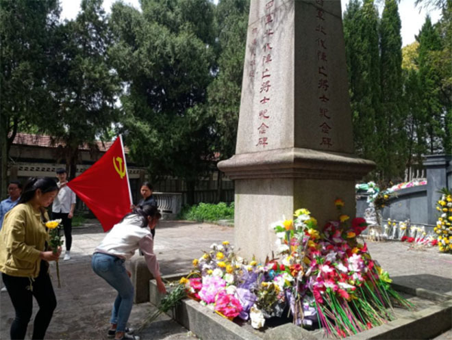 当天下午,38名党员及入党积极分子,首先参观了北伐战争汀泗桥战役纪念馆及遗址,后来到北伐战争烈士陵园。师生一起清理了阵亡将士纪念碑周边的杂物,瞻仰了阵亡将士纪念碑,向阵亡将士纪念碑祭献鲜花,重温了入党誓词,学生代表作了发言。