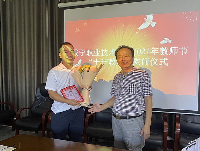 慰问会中,吴高岭向“十佳教师”吴昊颁发了荣誉证书,并赠送鲜花。吴昊老师表态说,感谢学校为他提供了学习的平台,在今后的工作中将更加努力地做好园林技术专业技能竞赛和教育教学工作。