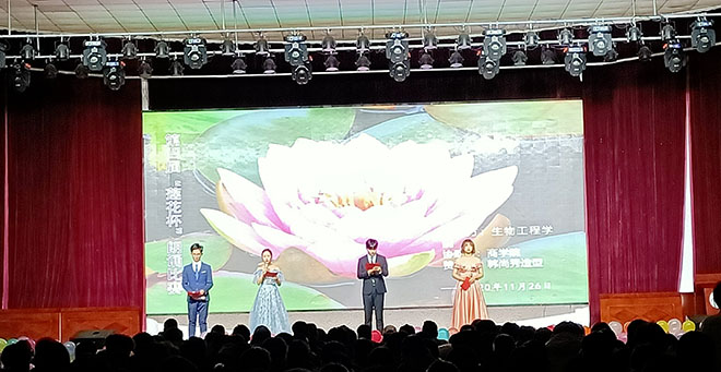 为致敬武汉抗疫英雄,歌颂抗疫道路上最美逆行者,11月26日晚7时,由生物工程学院主办,商学院协办的“莲花杯”朗诵比赛在大学生活动中心举行。