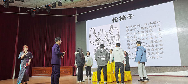 朗诵比赛中期,为活跃比赛带来的紧张气氛,积极带动老师同学的情绪,主持人安排了三个游戏项目:抢椅子、正话反说、击鼓传花,并随机在台下抽部分同学上台做游戏,掀起热浪,同学们积极上台,踊跃参加游戏,在下面观看的老师也不禁上台与同学们一同参与。