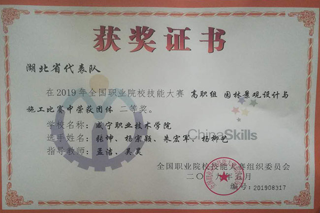 6月1日至6月2日,2019年全国职业院校技能大赛“园林景观设计与施工“赛项在杨凌职业技术学院举行。全国职业院校技能大赛是我国目前社会影响最大的国家级职业院校技能赛事,此次比赛共有来自全国各地的57支代表队的228名参赛选手参加了比赛,我院代表队荣获”园林景观设计与施工”团体二等奖。