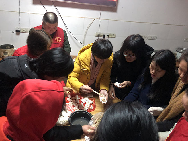 上午,志愿者们先是去嘉鱼宝康精神病医院,去看望了那里的精神病患者,与他们一起交流,给他们送上了小礼品。下午,志愿者们来到官桥镇褔利院看望那里的孤寡老人,为他们带去了小礼品、保暖衣裤和副食,老人们对志愿者们的到来表现的很热情,也很开心,拿到礼品的老人都迫不及待的穿上了志愿者们带来的保暖衣物;志愿者们发完衣物后,还为福利院的老人们包饺子、准备晚餐,老人们吃到热气腾腾的饺子时,一个个脸上都洋溢着幸福的笑容。
