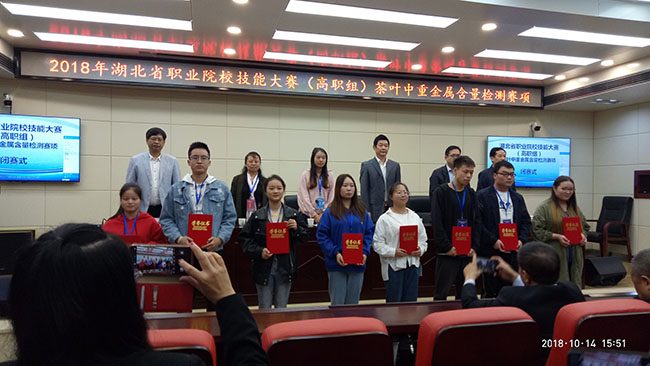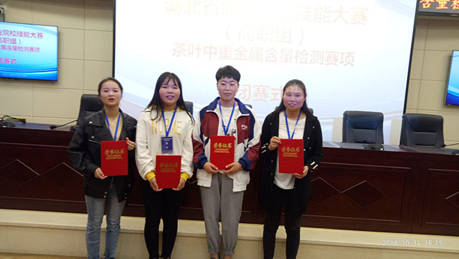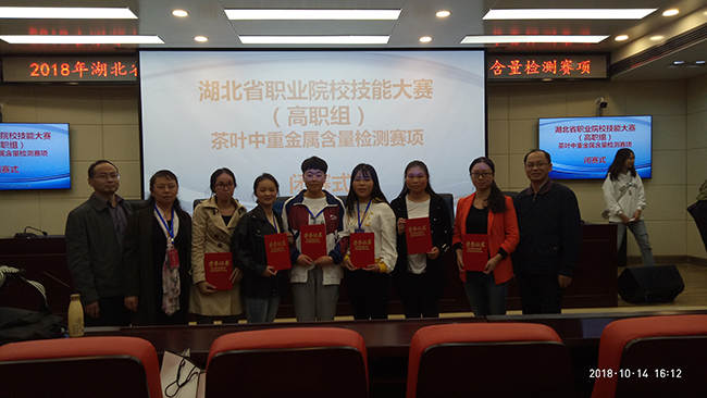 2018年湖北省职业院校技能大赛(高职组)“茶叶中重金属含量检测”赛项于10月14日在湖北生物科技职业学院顺利落幕。我校生物工程学院由推荐选手马晶和张慧霞、抽测选手何靖和李佳四位同学组成的参赛队,经过激烈角逐,荣获个人一等奖3项,个人三等奖1项的优异成绩,刘秀娟老师、孙连连老师荣获优秀指导老师奖。