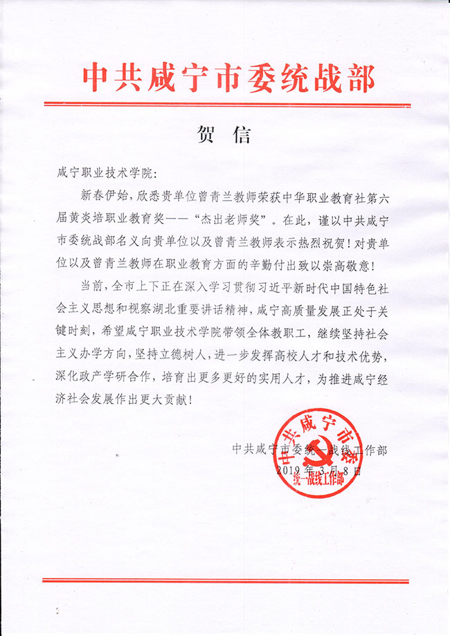 市委统战部对曾青兰教授获得黄炎培职业教育奖表示热烈祝贺和崇高敬意,希望咸宁职业技术学院带领全体教职工,继续坚持社会主义办学方向,坚持立德树人,进一步高校人才和技术优势,深化政产学研合作,培育出更多更好的实用人才,为推进咸宁经济社会发展做出更大贡献。