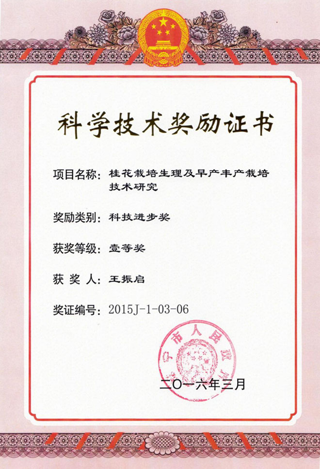 第四届咸宁市科学技术进步奖2016年9月揭晓,我校生物工程学院王振启教授参与的科研项目“桂花栽培生理及早产丰产栽培技术研究”荣获科技进步一等奖。该成果转化初期为企业和桂花镇花农年直接创收逾千万元,在咸宁市具有很高的推广价值,发展潜力巨大。这是王振启继2014年获得我市首届自然科学优秀学术成果政府奖一等奖后的又一突破。
