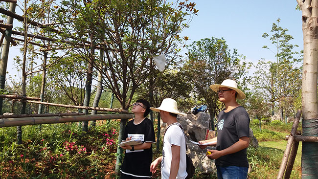 嘉鱼新街镇道路绿化工程全长8公里,工程内容包括微地形造型、乔灌木、色块、草坪种植、园路、亭子、廊架、景石布置、溪流等,本工程工程量大、范围广、涉及项目多,学生每天早上6:00就起床到工地,不畏高温,在烈日炎炎下认真进行工程测量,一天下来每个学生就都晒得黑了一圈,但个个干劲十足,认为虽然这次实训很辛苦,但加深了对专业知识的理解,可以从中学到很多东西,