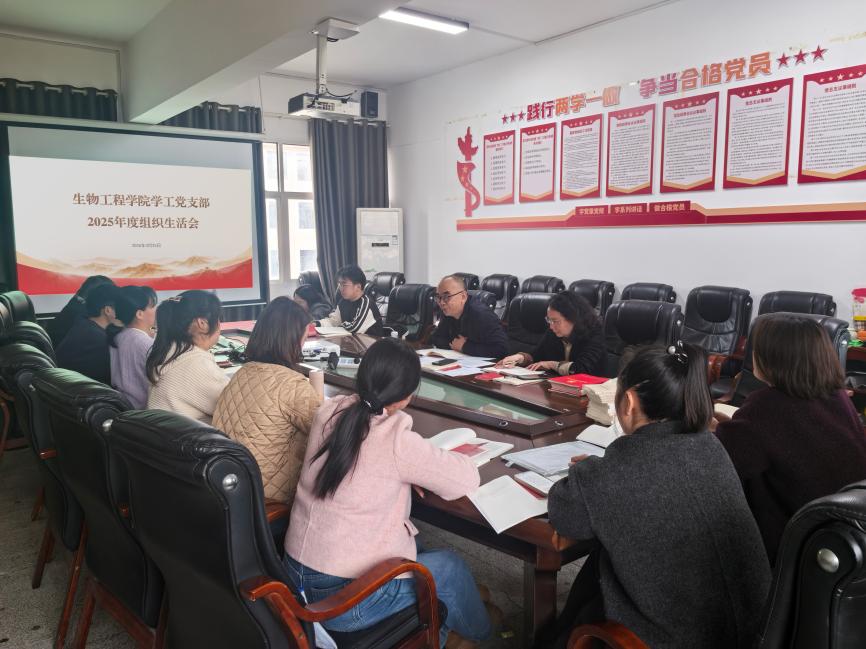 3月25日下午,生物工程学院学工党支部在学院四楼会议室召开2025年度组织生活会暨民主评议党员会议。支部全体党员参加会议,会议由支部书记胡美勇主持。