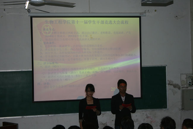 问渠那得清如许,唯有源头活水来。为加强学生管理,提高学生办事能力与思想水平。“生物工程学院2014-2015届主要学生干部选举暨换届大会”于10月14日晚7:00在生物楼103举行,出席本次大会的评委有:党总支书记李晓宏,团总支、学生会各部门主要负责人及14及全体干事参加了本次大会。